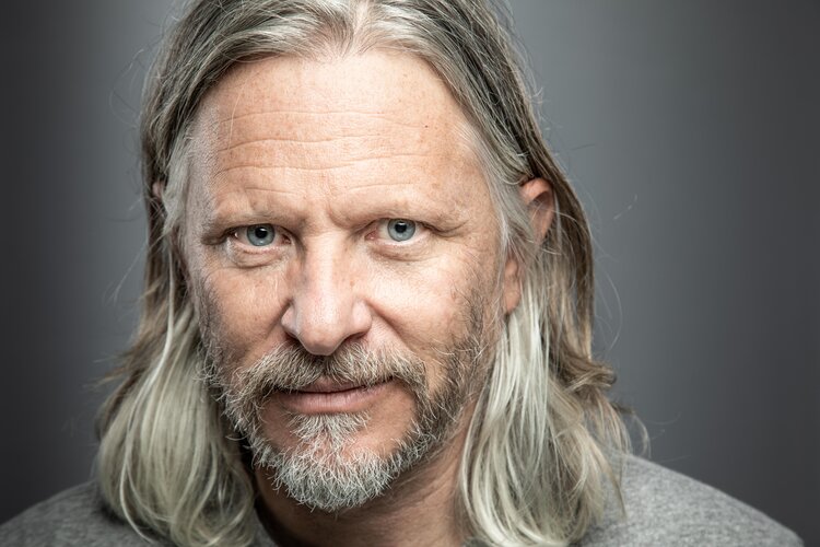 For the the image that kicks of this post used three lights: A strobe in a beauty dish above and directly in front of the subject with a silver reflect below and in front to lessen the shadows, and two strobes in soft boxes in the rare on either side pointed at 45 degrees towards the subjects back to help him pop off of the background (kickers or rim lights). The background is actually a white background but without light directly aimed at it the background falls away to gray.